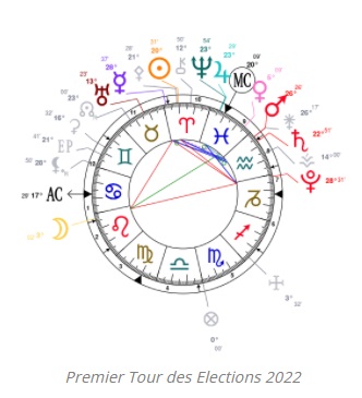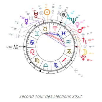 Si on superpose le Thème Astral d’Emmanuel Macron sur celui du début d’année 2022, on remarque tout de suite qu’il aura un rôle important à jouer. Son implication sera décisive dans de nombreux domaines : crise boursière, crise sociale, crise sanitaire, crise vaccinale, etc…